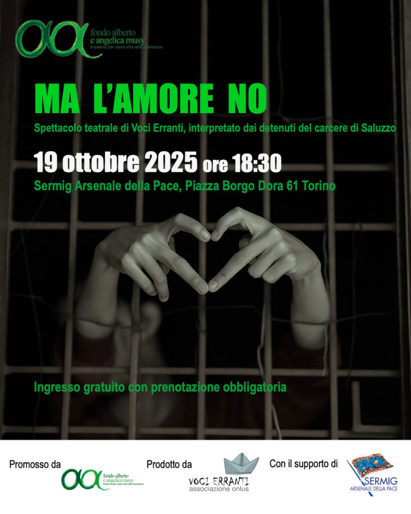 Domenica 19 ottobre 2025 alle ore 18.30, il Sermig – Arsenale della Pace di Torino ospiterà lo spettacolo “Ma l’amore no”, messo in scena dai detenuti della sezione di alta sicurezza della Casa di Reclusione di Saluzzo e promosso dal Fondo Alberto e Angelica Musy, impegnato da oltre 10 anni nel sostegno alle persone detenute. Nato dal progetto […]